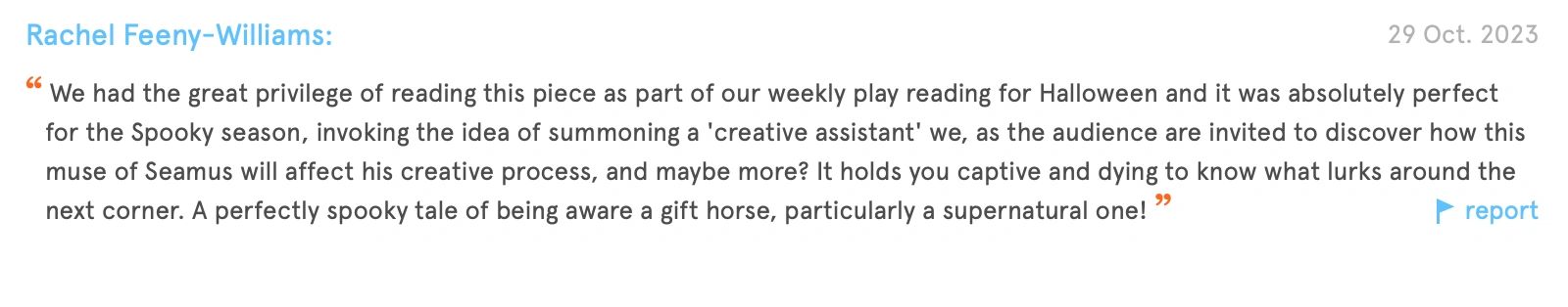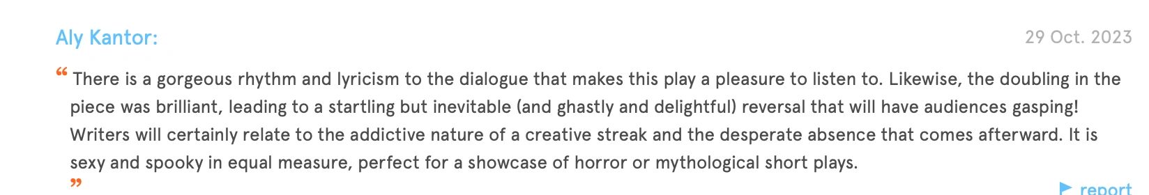 Three friends spend a snowy Christmas night in the home of Lord Dudley. A mysterious What would you give to write your best work? Would you ask for supernatural help? Sell your soul? SEAMUS, writer of fiction and poetry, hasn't published any work since his last - seven years ago. Everything he has written has been rejected for numerous reasons. In an act of desperation, he calls for someone/something to help him - to be his muse. SOPHIA, SEAMUS' niece, a promising film director and producer takes her uncles work, adapts it into a film. Is her success without assistance?